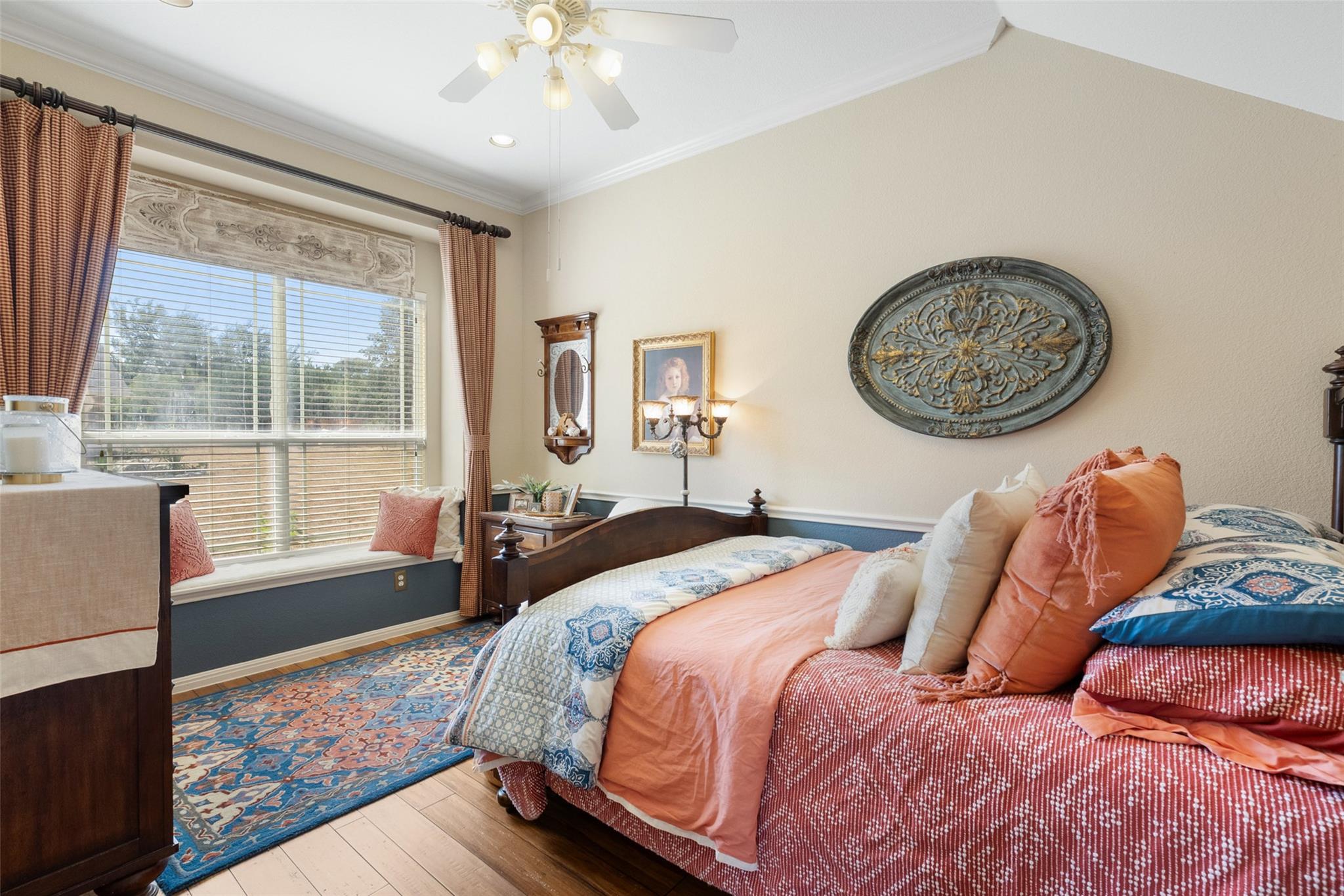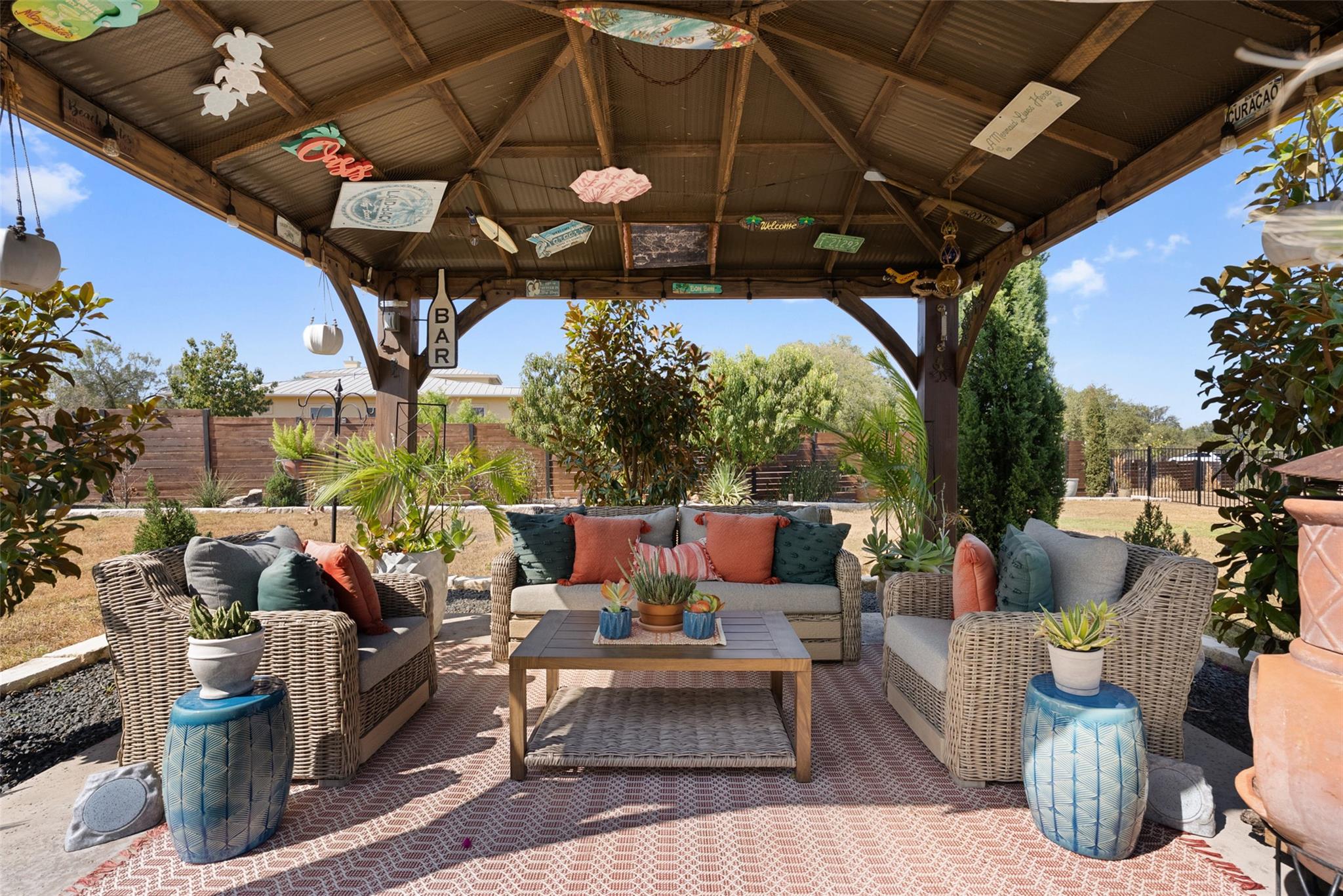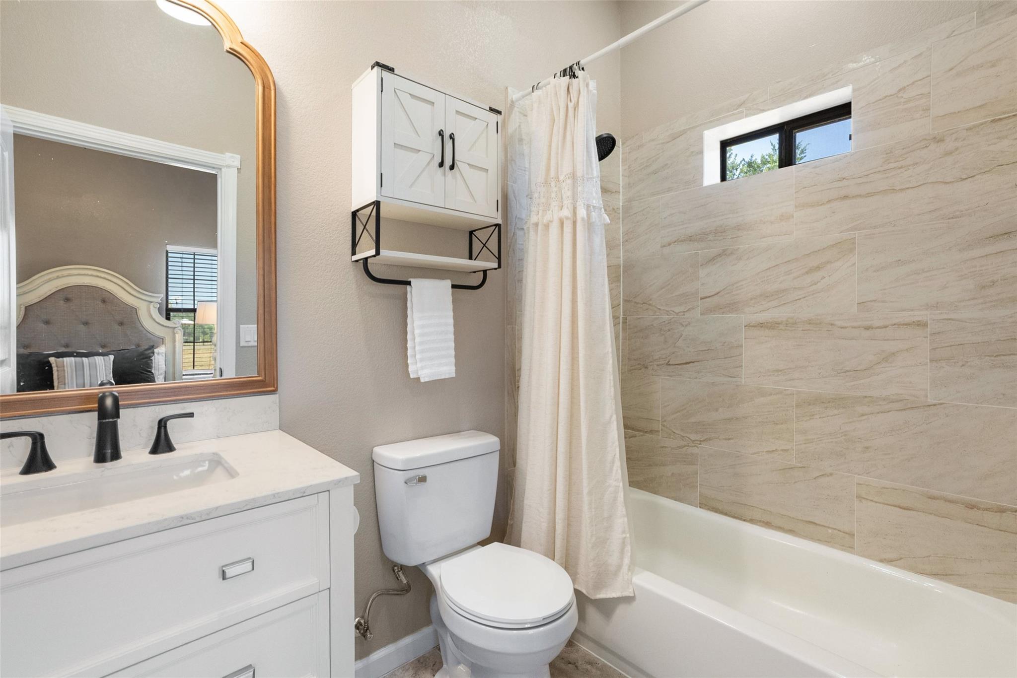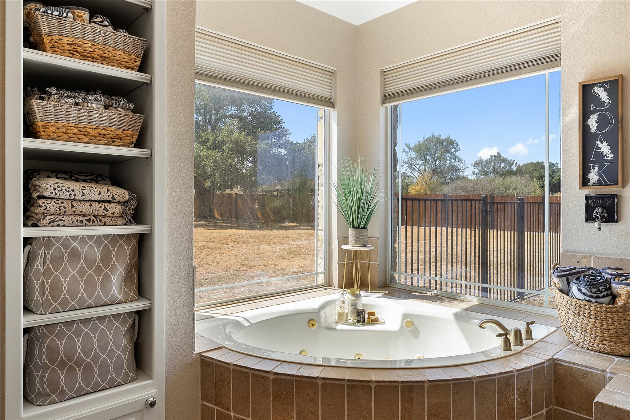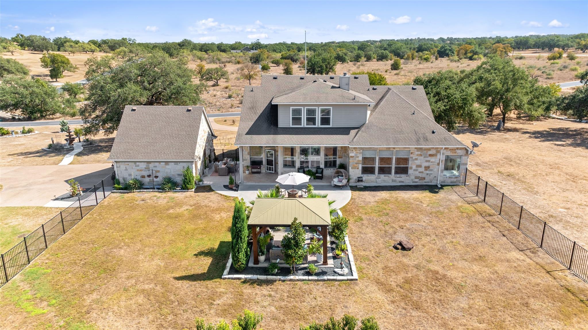 Set on 4.33 acres beneath majestic oak trees in the gated community of Double Horn, this exceptional property blends elegant Hill Country living with multi-generational versatility. Formerly a David Weekley model home, the main residence spans 1.5 stories and showcases timeless craftsmanship throughout. A welcoming covered front porch opens to interiors featuring hand-scraped bamboo flooring and rich architectural details. The study includes custom built-ins and wainscoting, while the formal dining room is enhanced by an elegant chandelier. The chef's kitchen offers granite countertops, a large island with sit-up bar, ample cabinetry, warming drawer, wall oven, and instant hot water. The breakfast area, surrounded by windows, flows into the living room with a natural stone fireplace, built-ins, and a wall of windows framing the private acreage. The main-level primary suite features wood floors, high ceilings, access to the covered porch, and a spa-inspired bath with stone tile, dual vanities, jetted tub, and separate shower. Downstairs, a media/game room connects to two bedrooms and a full bath, while upstairs includes an oversized game room, full bath, and a bedroom with kitchenette--ideal for guests or extended family. Outdoor living is equally inviting, with multiple covered decks, a gazebo, and charming spaces for alfresco dining. A detached three-car garage, circular drive, and ornamental fountain complete the main home. The 1,810 sq. ft. guest house adds tremendous flexibility with four bedrooms (each with ensuite baths and quartz counters), two kitchens, two living areas, and both shared and private covered porches--perfect for dual-family living. Up to 2 horses allowed. Residents of Double Horn enjoy a community pool, pavilion, playground, basketball court, and scenic trails, all minutes from Marble Falls, Bee Cave, Lake Travis, and Lakeway. A rare blend of craftsmanship, comfort, and space, this Double Horn estate captures the best of Hill Country living.