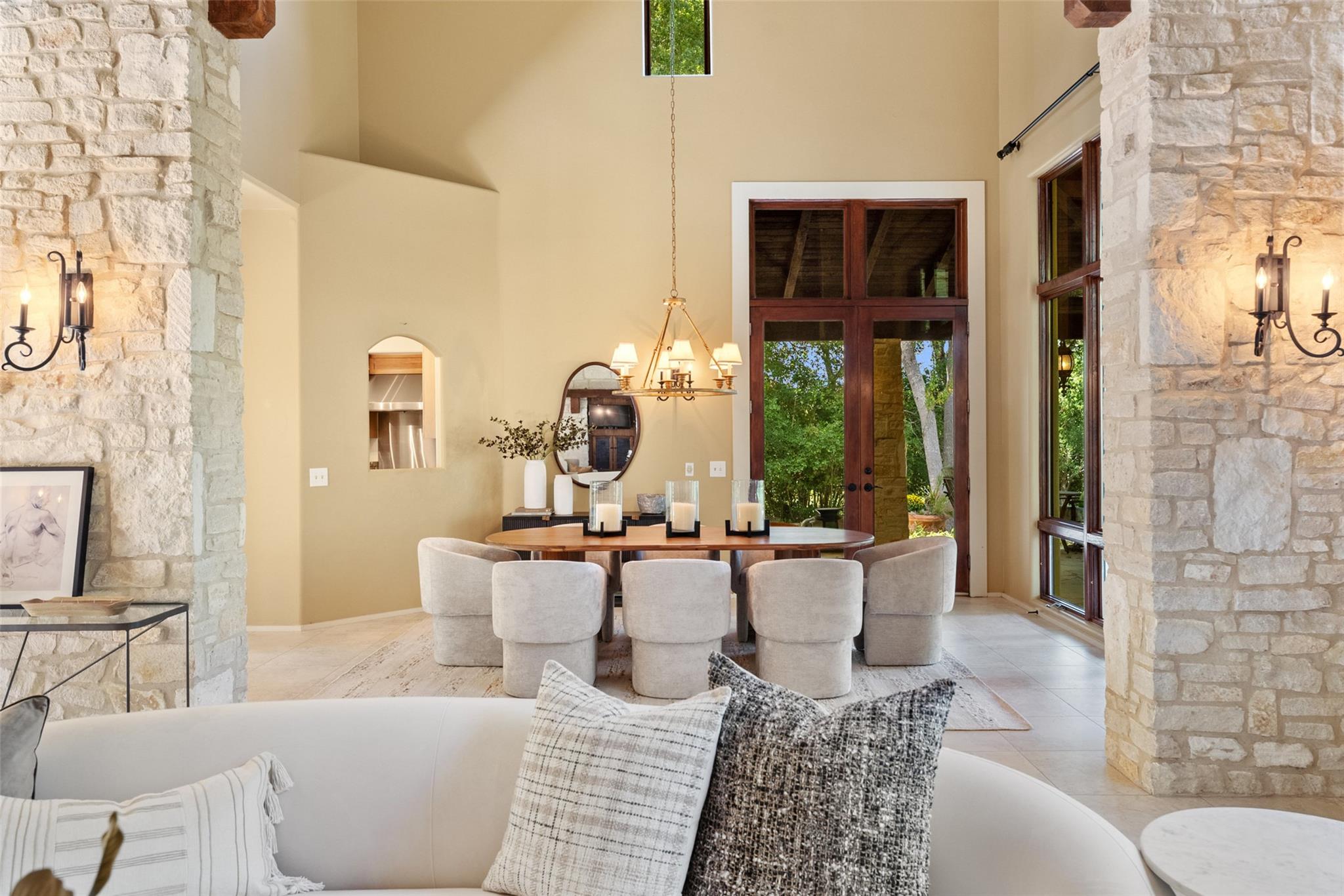 Other Interior Features: Bookcases, Built-in Features, Ceiling Fan(s), Beamed Ceilings, Cathedral Ceiling(s), High Ceilings, Vaulted Ceiling(s), Chandelier, Granite Counters, Double Vanity, Eat-in Kitchen, Entrance Foyer, French Doors, Kitchen Island, Multiple Dining Areas, Multiple Living Areas, Natural Woodwork, Open Floorplan, Pantry, Primary Bedroom on Main, Recessed Lighting, Walk-In Closet(s)