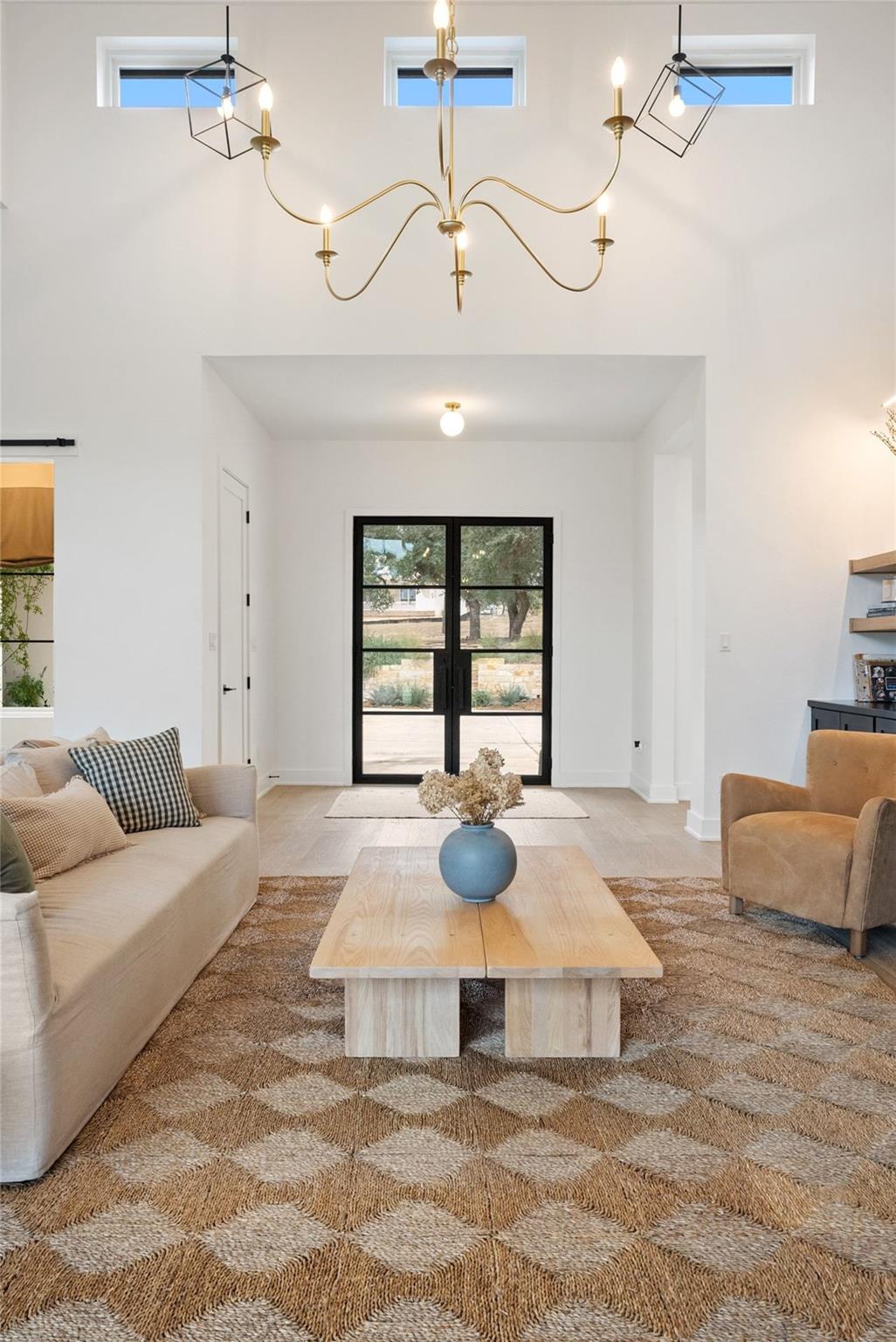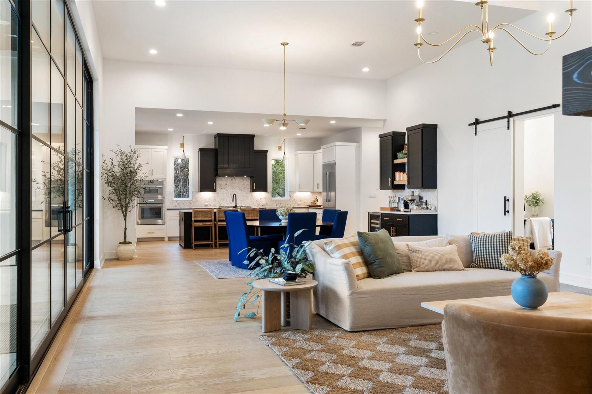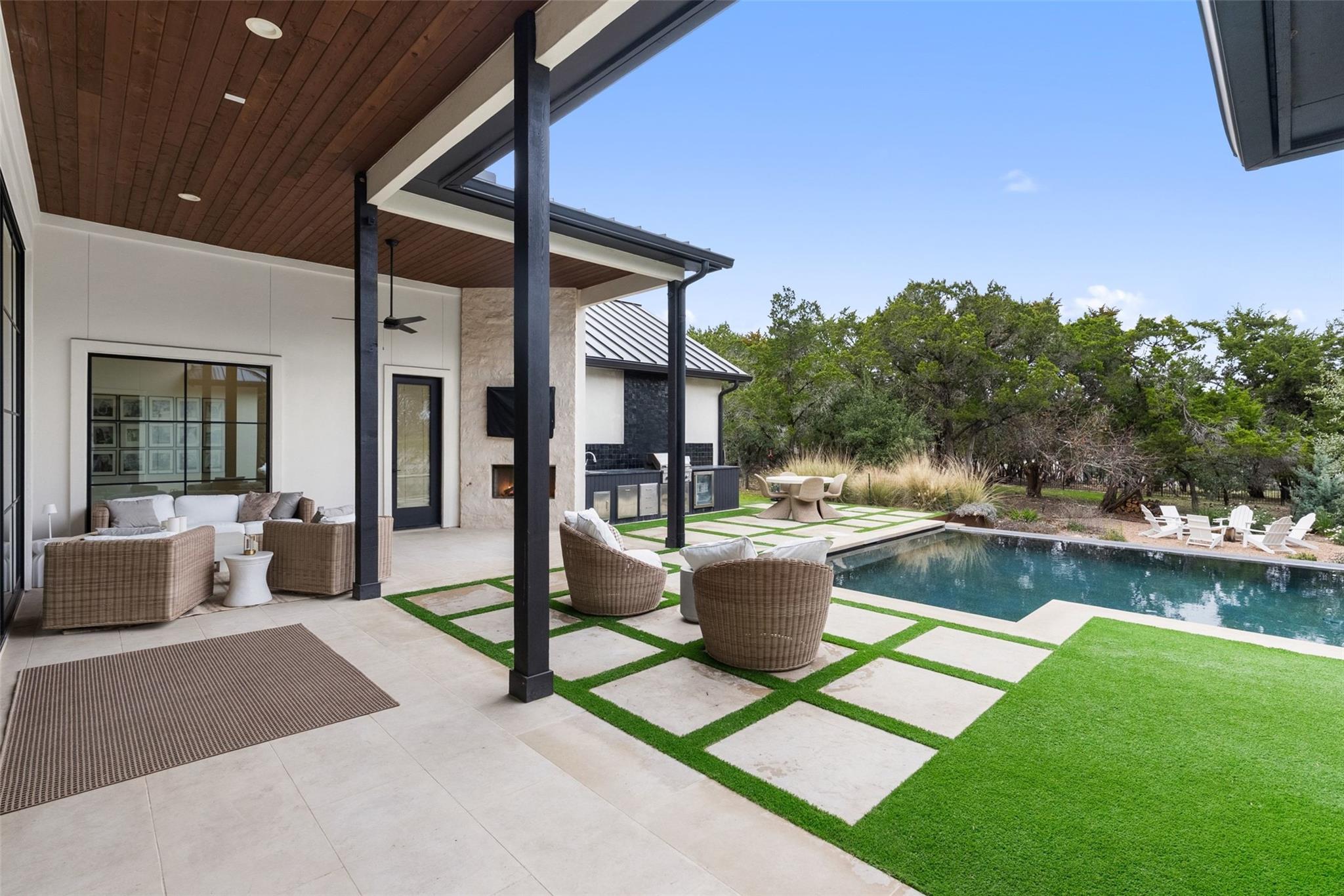 Welcome to a refined retreat in the coveted La Ventana community of Driftwood, where thoughtful architecture, elevated finishes, and natural beauty come together on 1.58 private, tree-filled acres. A long, winding driveway framed by landscaping sets a serene, nature-forward tone and offers exceptional privacy. Inside, natural light fills the open concept living, dining, and kitchen spaces, anchored by a dramatic custom steel and glass full wall window system with an integrated sliding door that creates a seamless indoor outdoor connection. European white oak flooring runs throughout, complemented by custom chandeliers, a statement fireplace with floating shelves, and effortless flow designed for living and entertaining. The chef's kitchen is a true centerpiece with a quartz-clad island, leathered granite countertops, and Thermador appliances. A dedicated planning room, along with a coffee and beverage bar features quartz counters, built-in storage, and a beverage refrigerator. Supporting spaces include a mudroom with custom lockers, a finished utility room with quartz counters and sink, and a private home office with built-ins located adjacent to a full bath--ideal for guests or work-from-home flexibility. The primary suite is a peaceful retreat with direct outdoor access. Outside, the fully fenced backyard features manicured zoysia lawn, native landscaping, irrigation, and ambient lighting. A covered patio with fireplace and fully equipped outdoor kitchen complete with soapstone counters, zellige tile, built-in grill, and beverage fridge sets the stage for year-round entertaining. Recent upgrades include updated lighting, fresh interior paint, whole house water filtration and softening, dual tankless water heaters, instant hot water, 220V garage wiring, and a rain catchment system supplying the pool. La Ventana residents enjoy miles of trails, equestrian paths, and a grand community lodge with pools, fitness, tennis, and pickleball, just a short drive to Austin.
