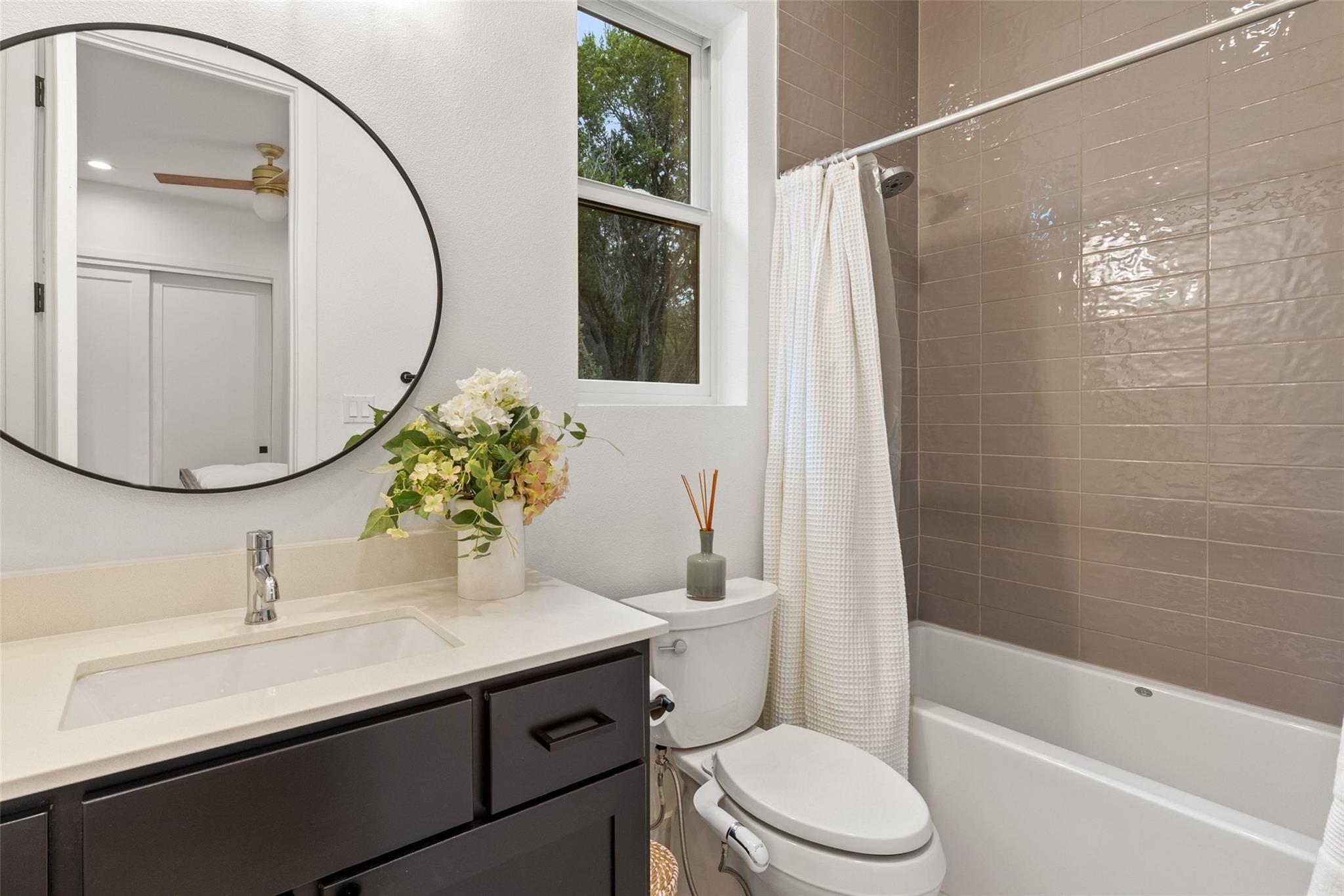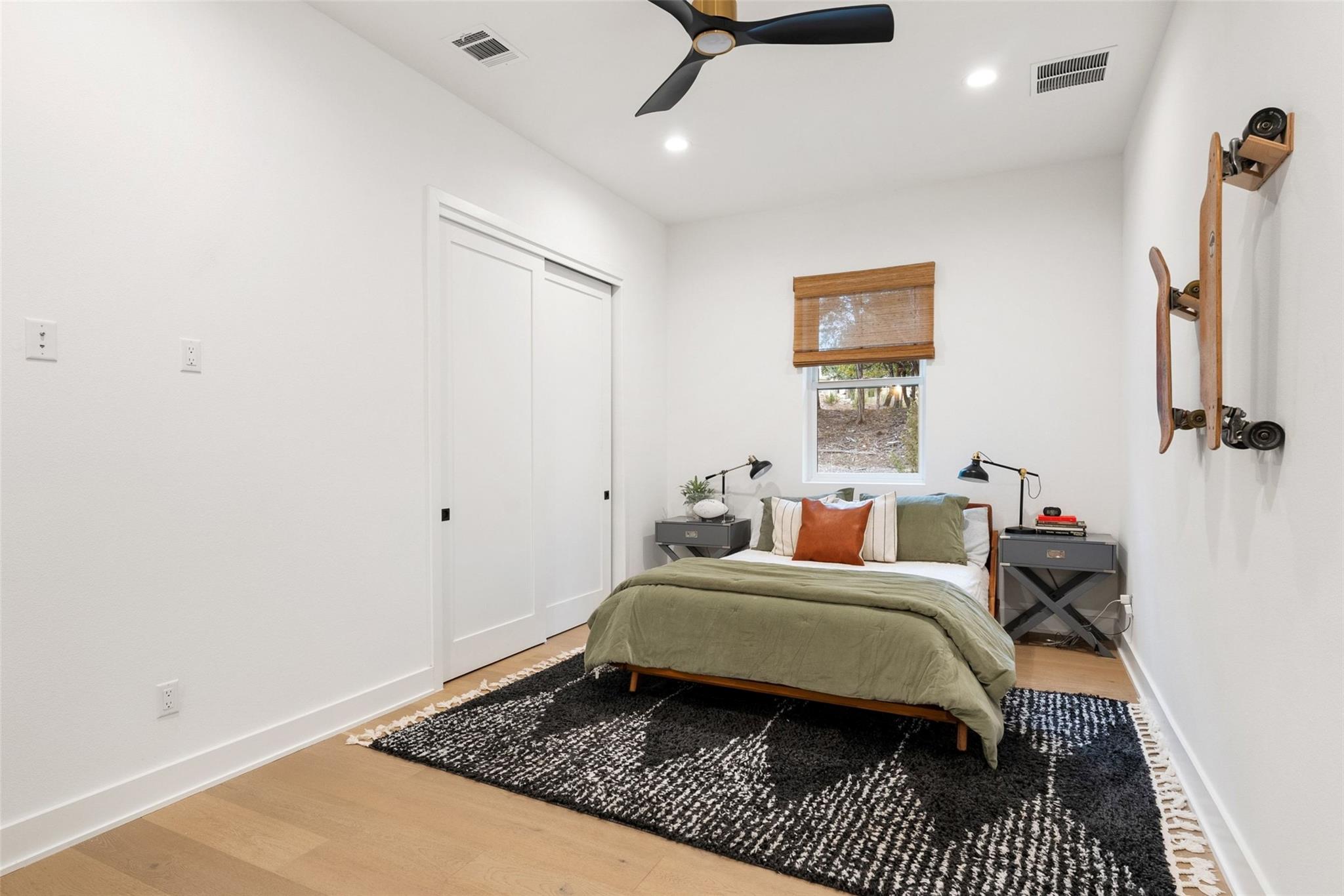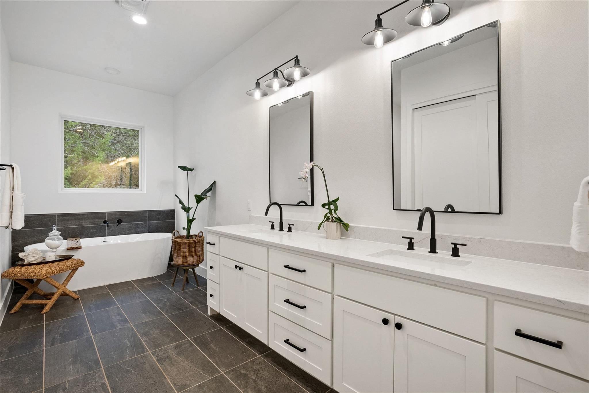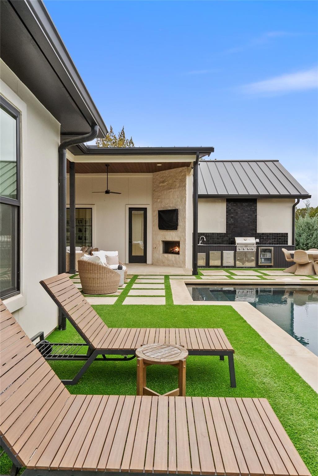 Welcome to a refined retreat in the coveted La Ventana community of Driftwood, where thoughtful architecture, elevated finishes, and natural beauty come together on 1.58 private, tree-filled acres. A long, winding driveway framed by landscaping sets a serene, nature-forward tone and offers exceptional privacy. Inside, natural light fills the open concept living, dining, and kitchen spaces, anchored by a dramatic custom steel and glass full wall window system with an integrated sliding door that creates a seamless indoor outdoor connection. European white oak flooring runs throughout, complemented by custom chandeliers, a statement fireplace with floating shelves, and effortless flow designed for living and entertaining. The chef's kitchen is a true centerpiece with a quartz-clad island, leathered granite countertops, and Thermador appliances. A dedicated planning room, along with a coffee and beverage bar features quartz counters, built-in storage, and a beverage refrigerator. Supporting spaces include a mudroom with custom lockers, a finished utility room with quartz counters and sink, and a private home office with built-ins located adjacent to a full bath--ideal for guests or work-from-home flexibility. The primary suite is a peaceful retreat with direct outdoor access. Outside, the fully fenced backyard features manicured zoysia lawn, native landscaping, irrigation, and ambient lighting. A covered patio with fireplace and fully equipped outdoor kitchen complete with soapstone counters, zellige tile, built-in grill, and beverage fridge sets the stage for year-round entertaining. Recent upgrades include updated lighting, fresh interior paint, whole house water filtration and softening, dual tankless water heaters, instant hot water, 220V garage wiring, and a rain catchment system supplying the pool. La Ventana residents enjoy miles of trails, equestrian paths, and a grand community lodge with pools, fitness, tennis, and pickleball, just a short drive to Austin.