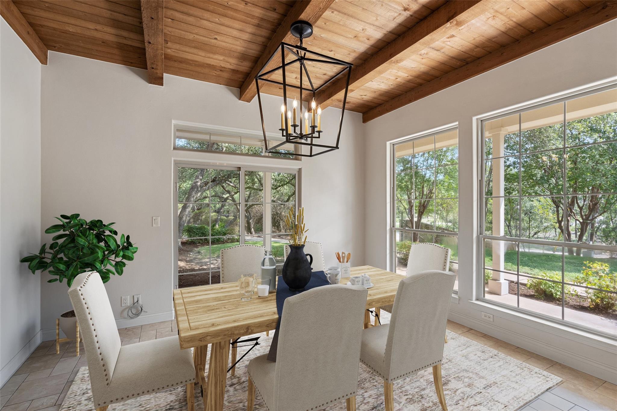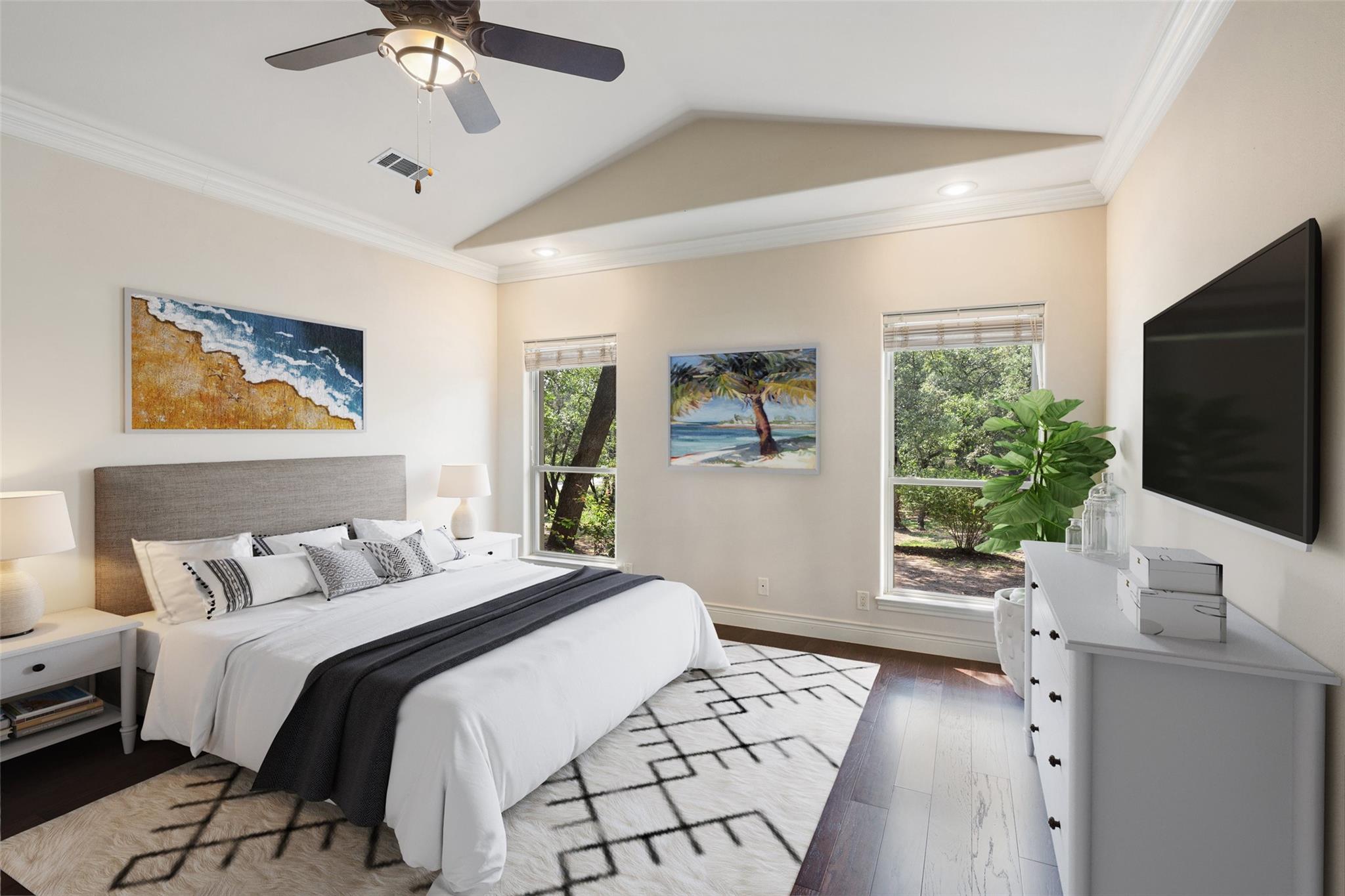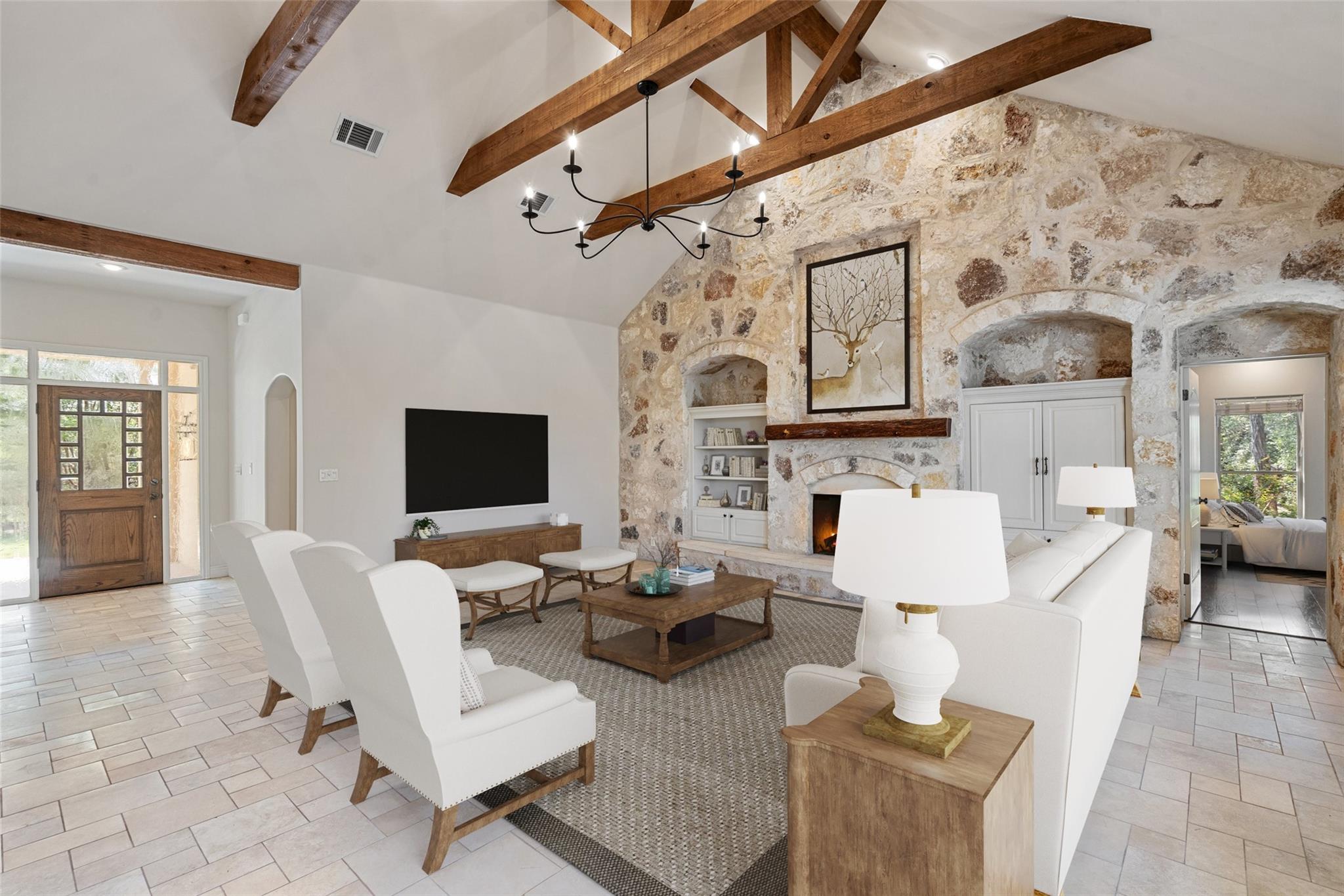 This move-in ready gem offers 3 bedrooms, 2.5 bathrooms, a home office suite, and a stunning gourmet kitchen with custom touches, perfect for entertaining. The living room boasts beautiful beamed ceilings, a striking stone-clad wall, and a cozy fireplace. The spacious primary suite includes two walk in closets, a garden tub, and separate shower.