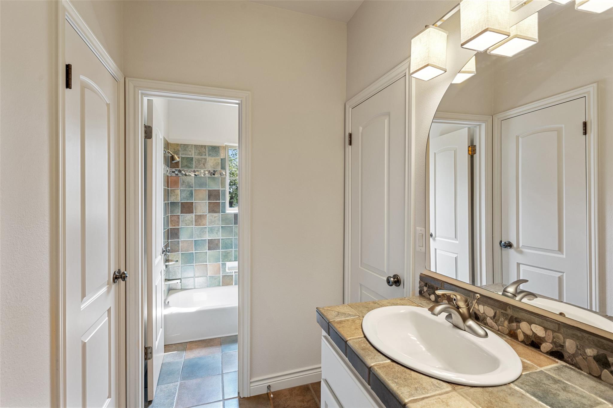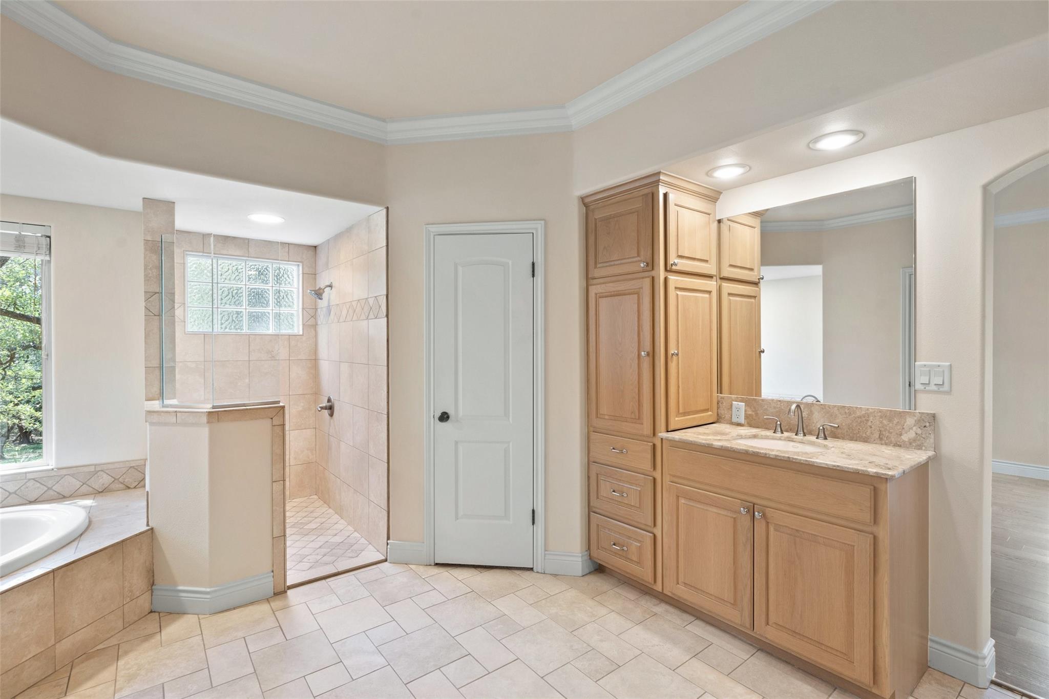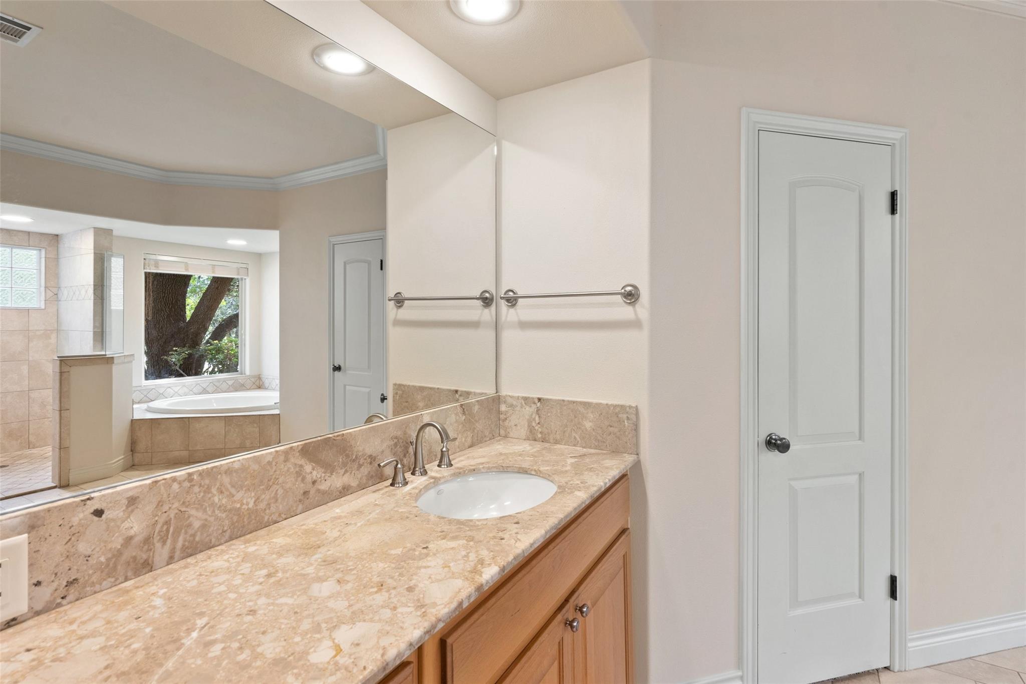 This move-in ready gem offers 3 bedrooms, 2.5 bathrooms, a home office suite, and a stunning gourmet kitchen with custom touches, perfect for entertaining. The living room boasts beautiful beamed ceilings, a striking stone-clad wall, and a cozy fireplace. The spacious primary suite includes two walk in closets, a garden tub, and separate shower.