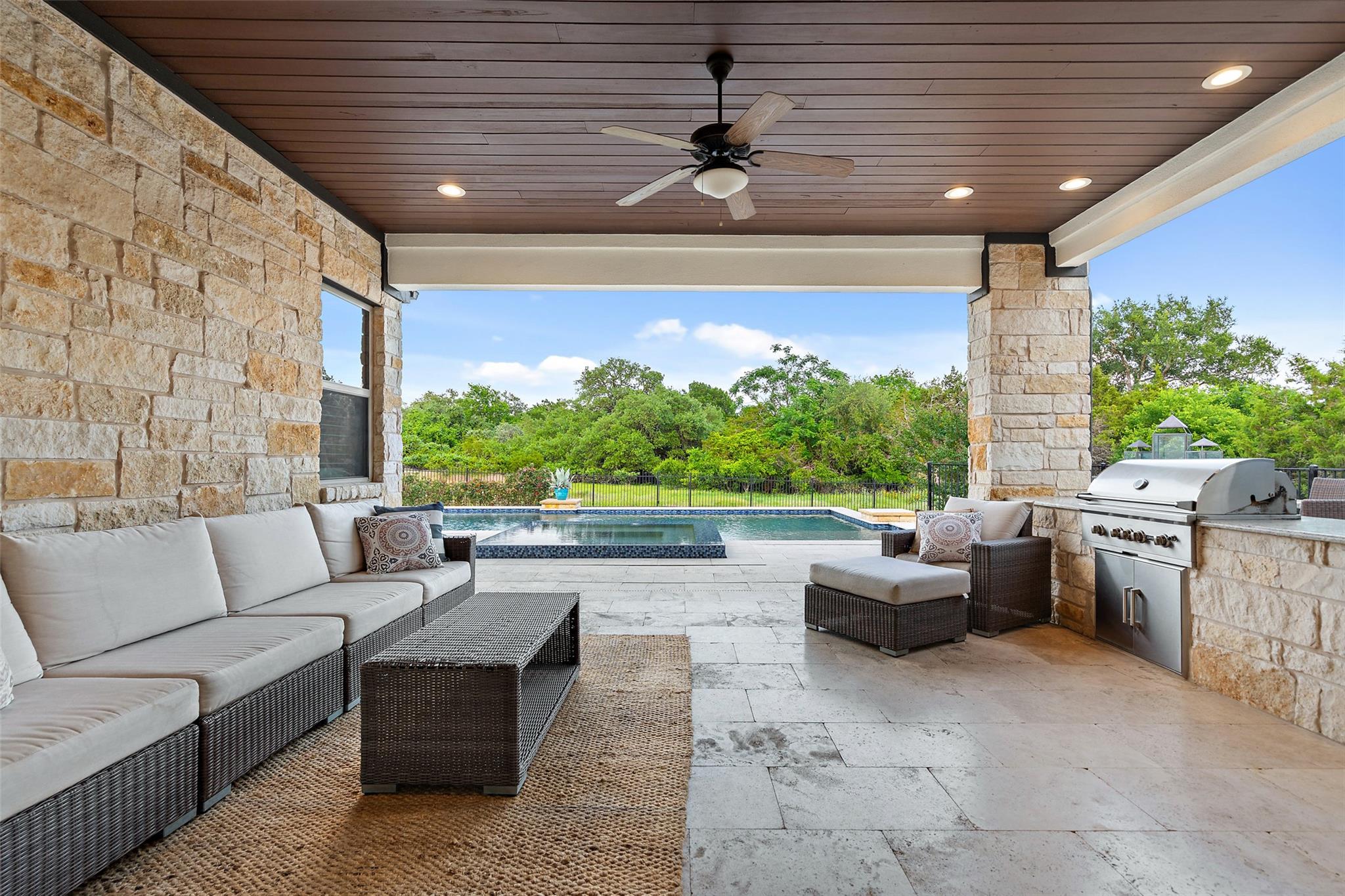 Beautiful single-story home on a 1-acre lot in desirable Rim Rock. Open floor plan with wood floors, soaring wood-beamed ceilings, and abundant natural light. Chef's kitchen features stainless appliances, granite counters, double islands, double ovens, prep sink, walk-in pantry, and custom cabinetry. Spacious living room with natural stone fireplace and large sliding doors opening to a covered patio with outdoor kitchen. Formal dining with unique beamed ceiling. Primary suite overlooks the pool and backyard, featuring a spa-like bath with double vanities, walk-in shower, soaking tub, and large closet. Private study with separate entrance, full bath, and closet could serve as a 5th bedroom or guest suite. Additional guest suite with ensuite bath, plus two bedrooms sharing a Jack-and-Jill bath. Mudroom with built-ins, planning center, and a large utility room with cabinetry and sink. Backyard retreat with heated pool, spa, and hardscape living spaces, large covered patio for outdoor living with gas grill. Pool/spa is heated and fully fenced. Hill Country living just minutes from Austin!