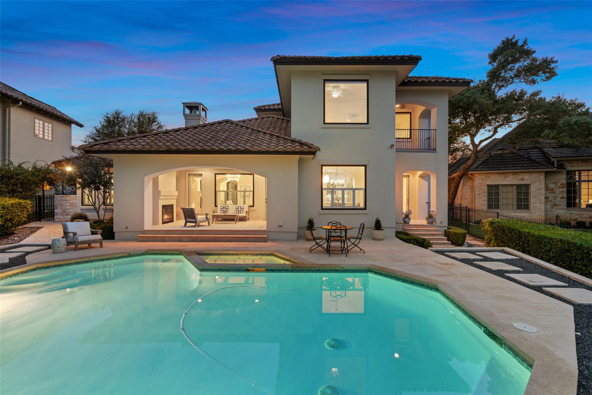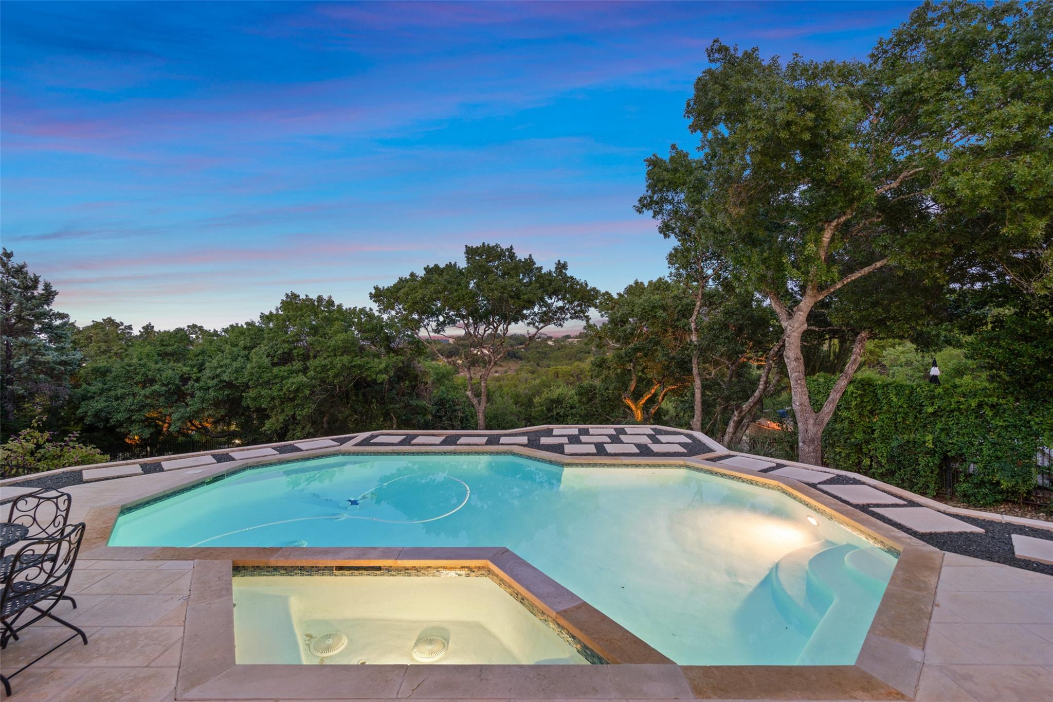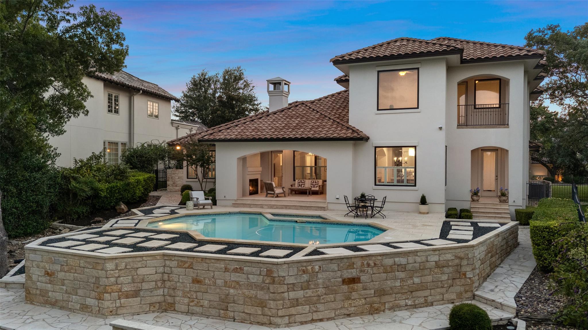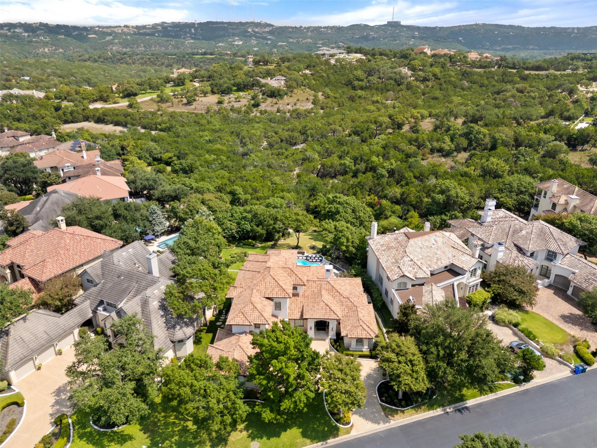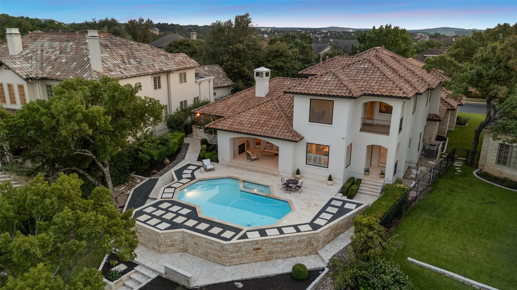 Built by Matt Butterfield and meticulously maintained by its original owners, this Santa Barbara-style home offers resort-style living with stunning Hill Country views. A 2017 kitchen remodel features Sub Zero and Wolf appliances, quartz countertops, and Ann Sacks tile backsplash, complemented by a custom wine room. The open family room showcases wood floors, walls of windows, and a cut-stone fireplace flanked by cabinetry. The primary suite includes a remodeled spa bath with Victoria + Albert soaking tub, frameless multi-head shower, dual vanities, and large closets. A main-level guest suite doubles as a pool bath. Upstairs, find a game/media room with private balcony, three bedrooms, two baths, and a flexible bonus room. Enjoy a resort-style pool and spa, outdoor fireplace, expansive yard, and reimagined outdoor kitchen with new grill, countertops, and fridge--all within a masonry and stucco exterior with steel entry doors. Additional highlights: oversized 3-car garage, wood flooring, recent HVAC/water heaters, and ample storage. Barton Creek Country Club Property Owners Membership conveys. Just 15 minutes to downtown Austin, with trails, shopping, and dining nearby.