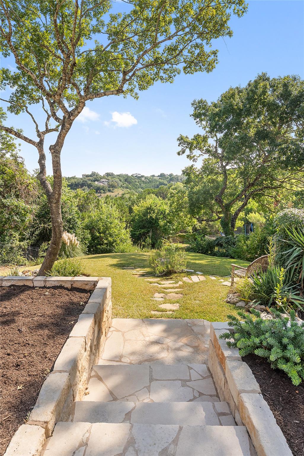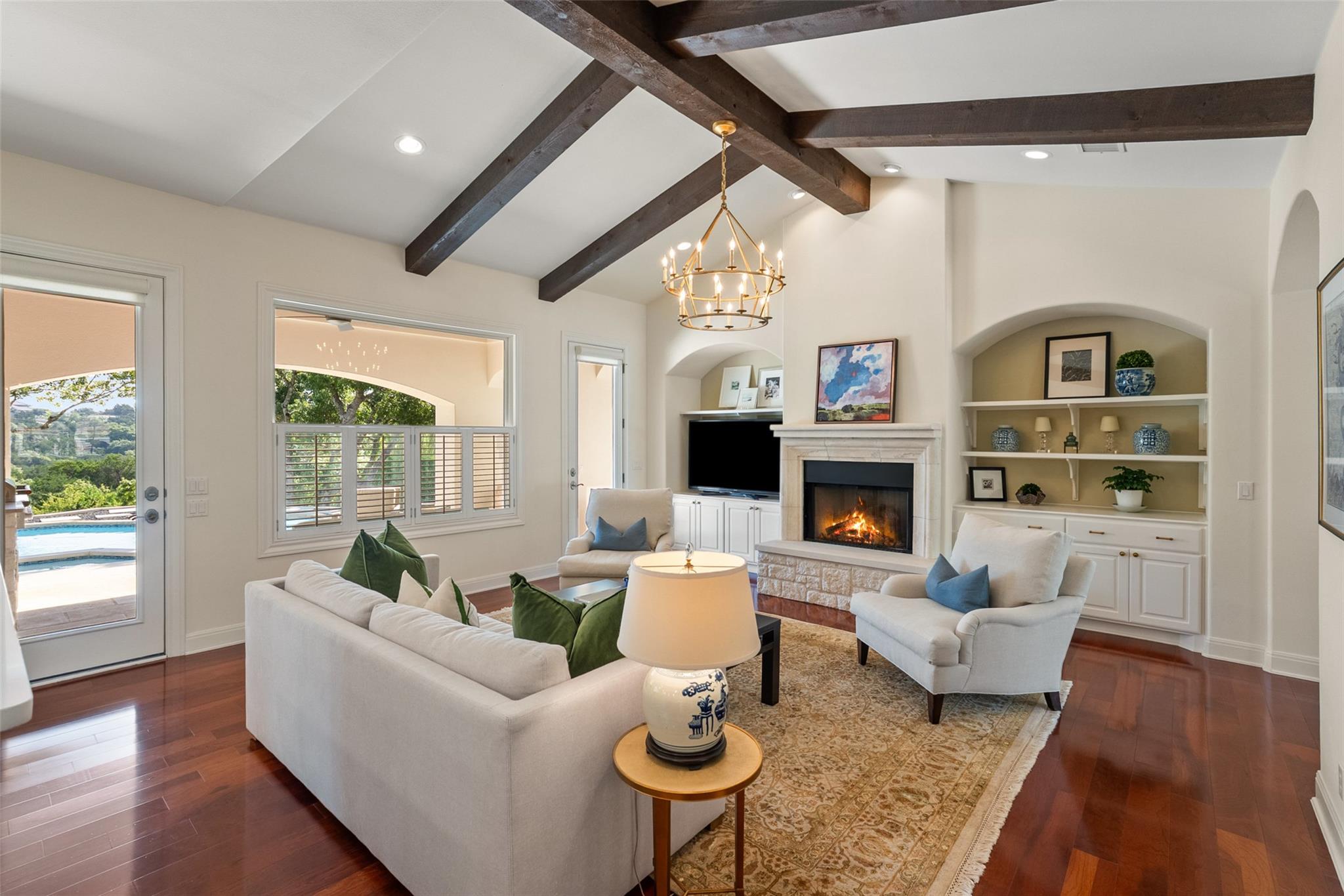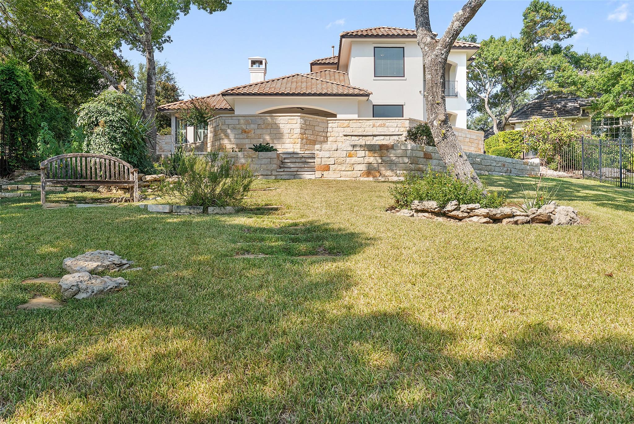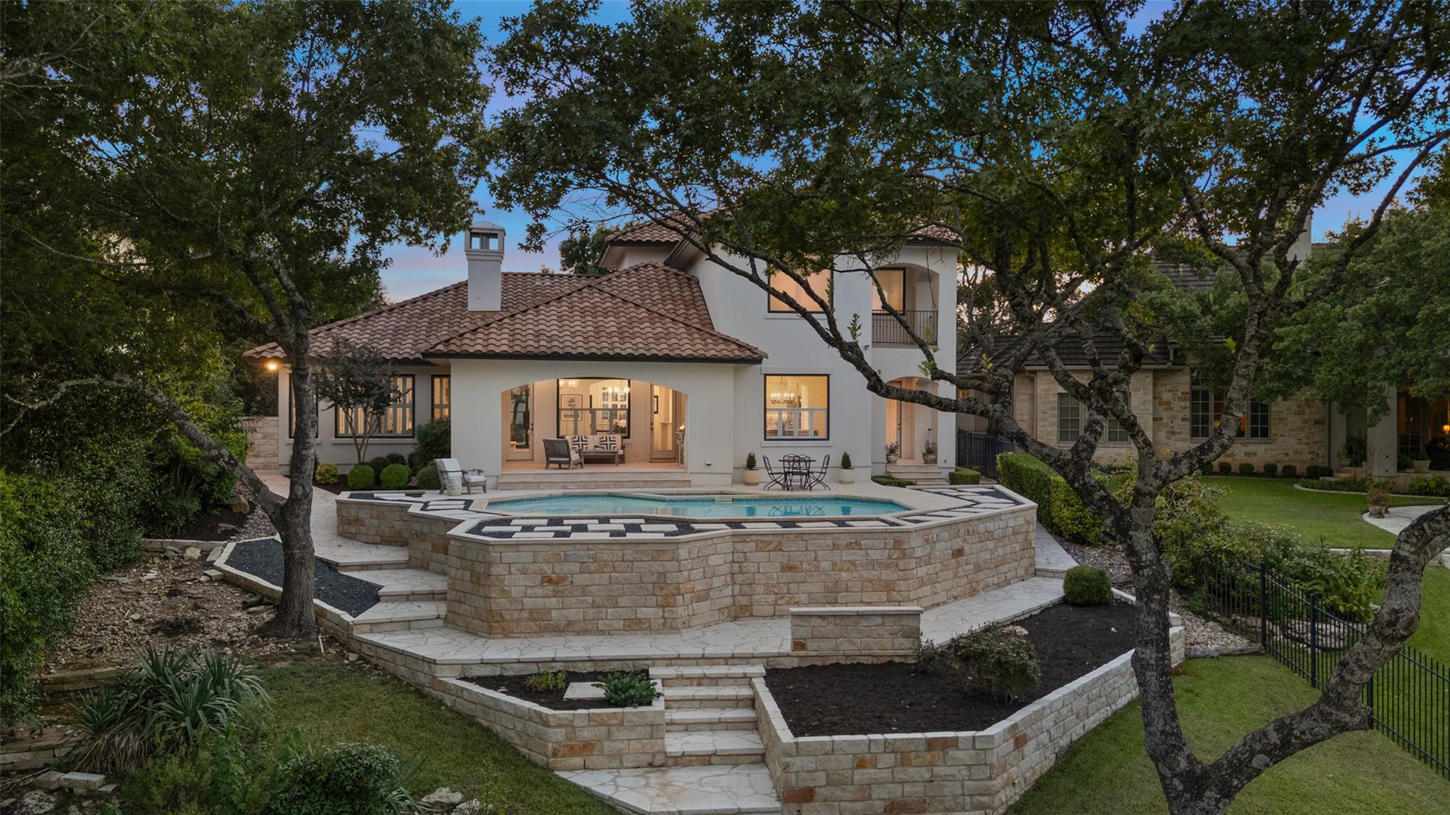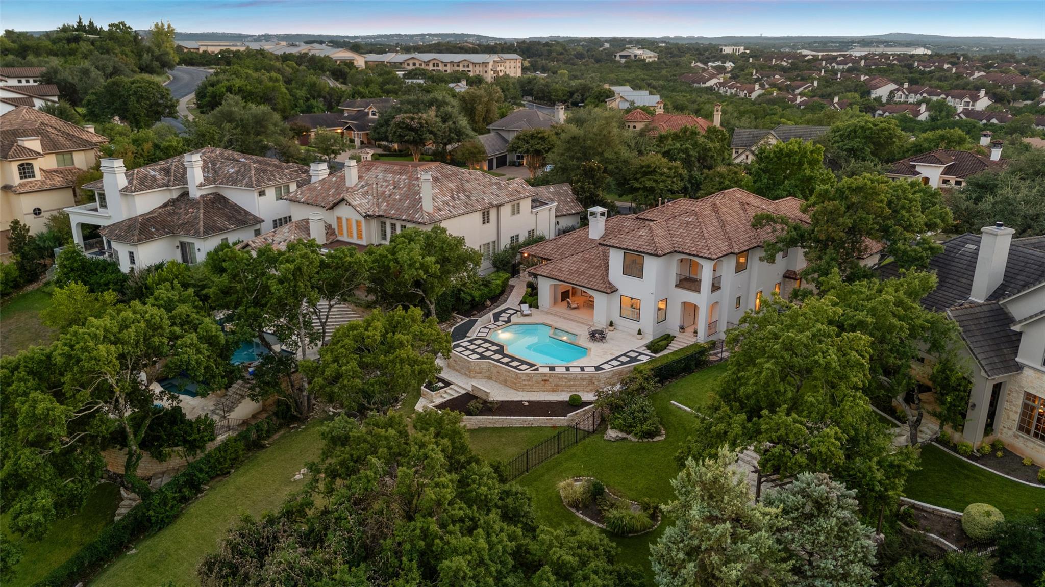 Built by Matt Butterfield and meticulously maintained by its original owners, this Santa Barbara-style home offers resort-style living with stunning Hill Country views. A 2017 kitchen remodel features Sub Zero and Wolf appliances, quartz countertops, and Ann Sacks tile backsplash, complemented by a custom wine room. The open family room showcases wood floors, walls of windows, and a cut-stone fireplace flanked by cabinetry. The primary suite includes a remodeled spa bath with Victoria + Albert soaking tub, frameless multi-head shower, dual vanities, and large closets. A main-level guest suite doubles as a pool bath. Upstairs, find a game/media room with private balcony, three bedrooms, two baths, and a flexible bonus room. Enjoy a resort-style pool and spa, outdoor fireplace, expansive yard, and reimagined outdoor kitchen with new grill, countertops, and fridge--all within a masonry and stucco exterior with steel entry doors. Additional highlights: oversized 3-car garage, wood flooring, recent HVAC/water heaters, and ample storage. Barton Creek Country Club Property Owners Membership conveys. Just 15 minutes to downtown Austin, with trails, shopping, and dining nearby.
