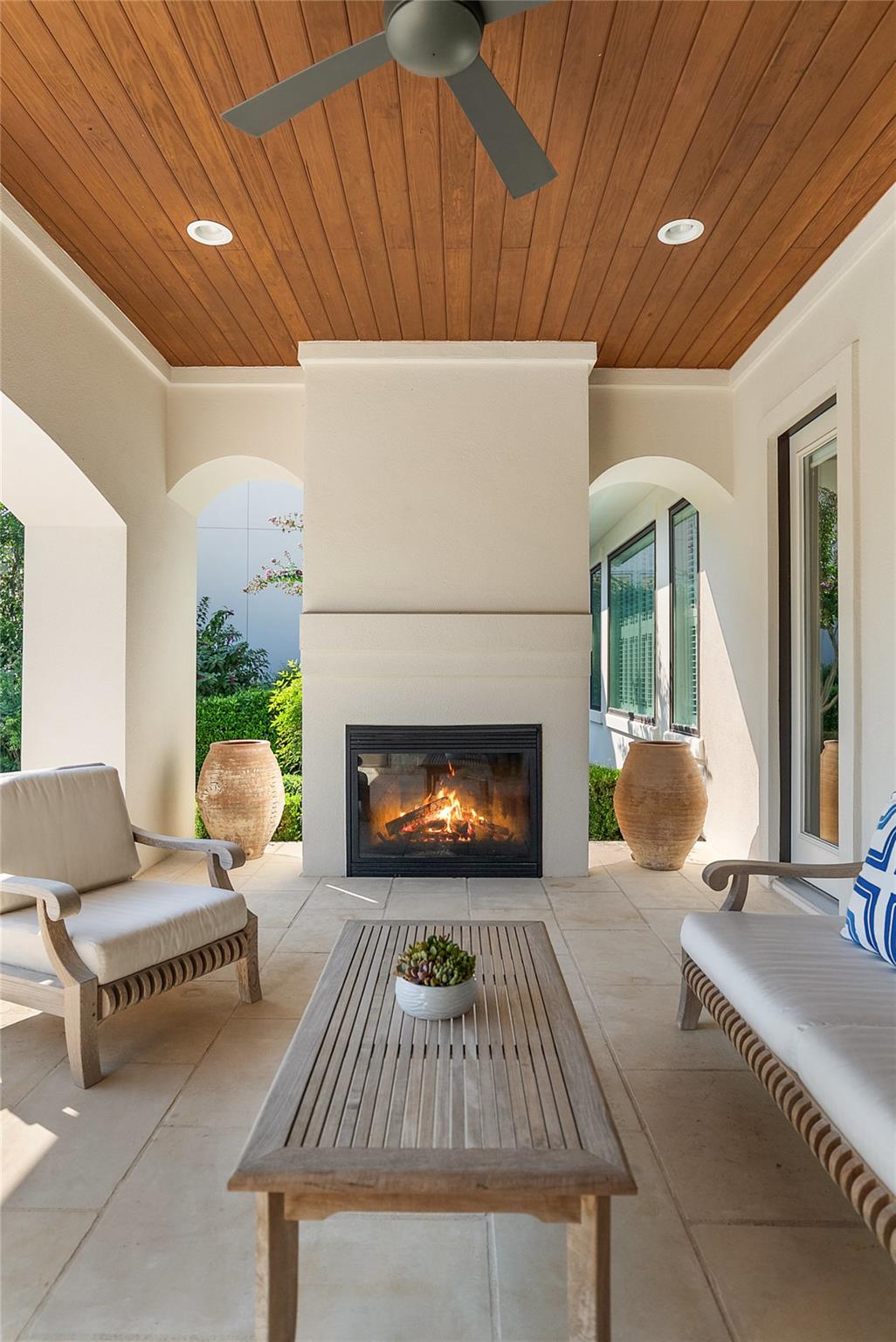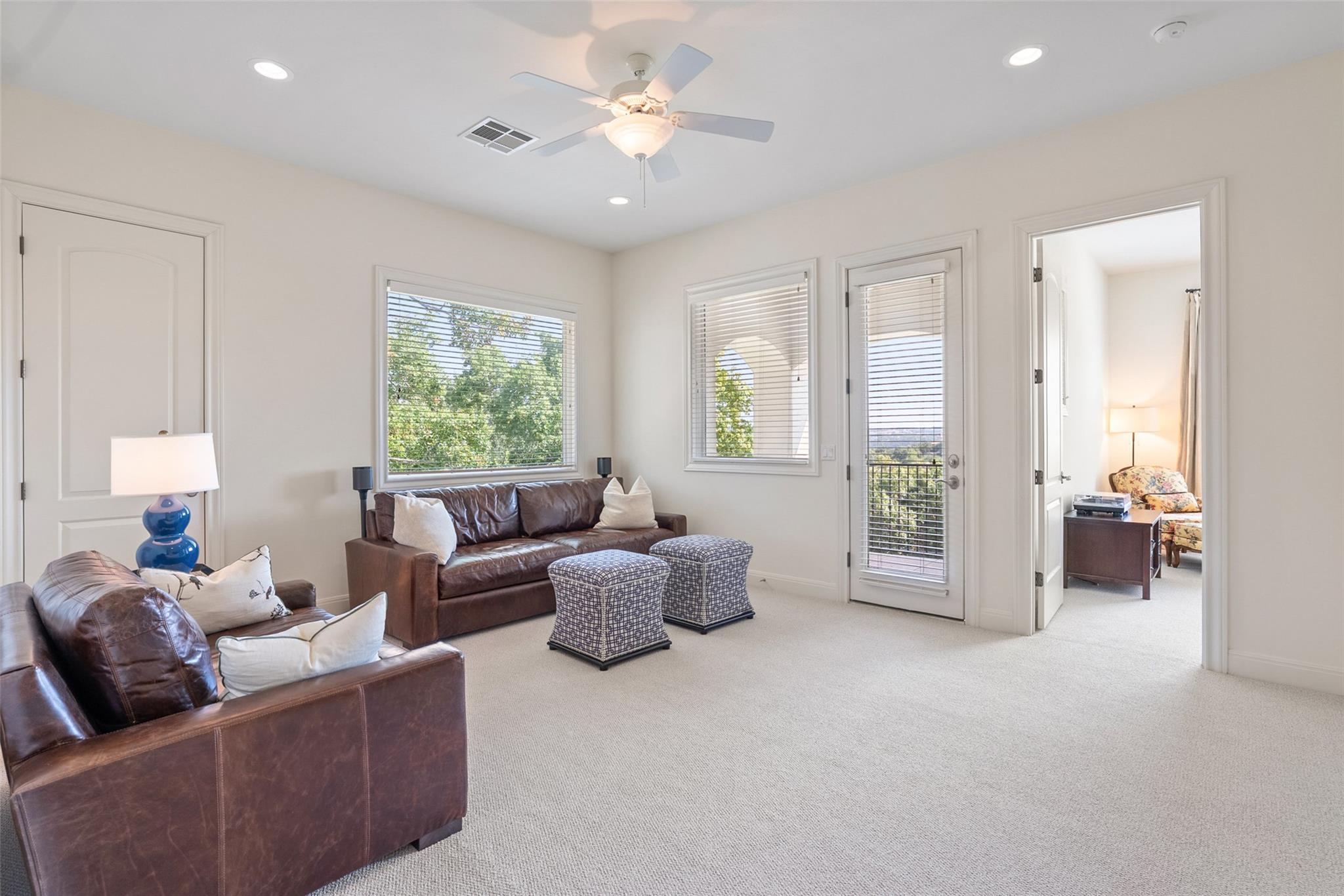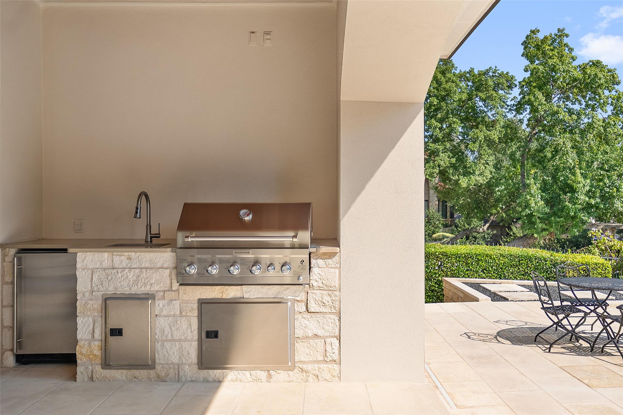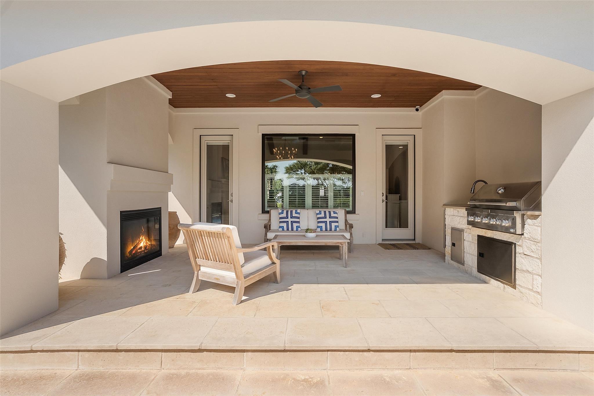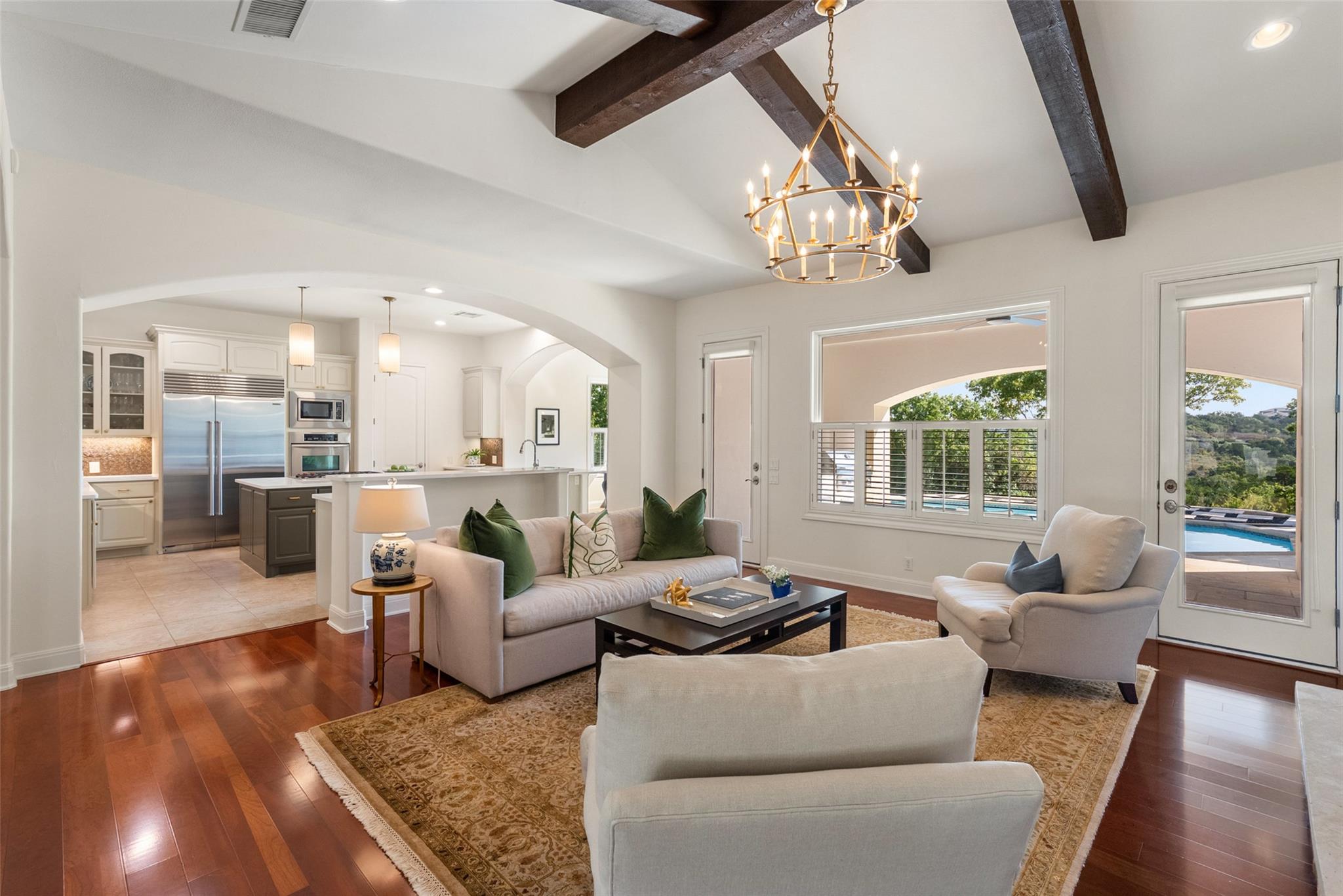 Built by Matt Butterfield and meticulously maintained by its original owners, this Santa Barbara-style home offers resort-style living with stunning Hill Country views. A 2017 kitchen remodel features Sub Zero and Wolf appliances, quartz countertops, and Ann Sacks tile backsplash, complemented by a custom wine room. The open family room showcases wood floors, walls of windows, and a cut-stone fireplace flanked by cabinetry. The primary suite includes a remodeled spa bath with Victoria + Albert soaking tub, frameless multi-head shower, dual vanities, and large closets. A main-level guest suite doubles as a pool bath. Upstairs, find a game/media room with private balcony, three bedrooms, two baths, and a flexible bonus room. Enjoy a resort-style pool and spa, outdoor fireplace, expansive yard, and reimagined outdoor kitchen with new grill, countertops, and fridge--all within a masonry and stucco exterior with steel entry doors. Additional highlights: oversized 3-car garage, wood flooring, recent HVAC/water heaters, and ample storage. Barton Creek Country Club Property Owners Membership conveys. Just 15 minutes to downtown Austin, with trails, shopping, and dining nearby.