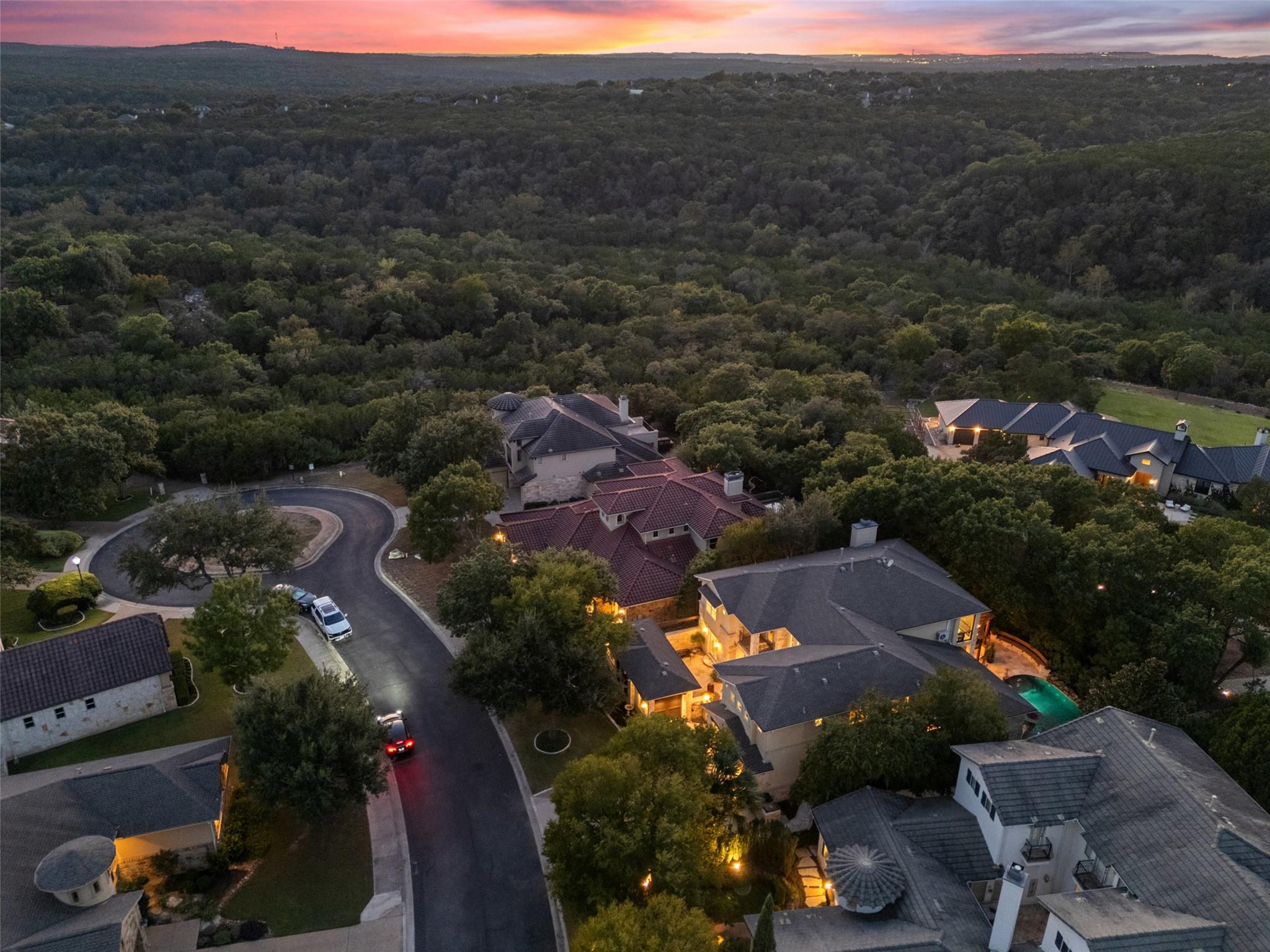 This elegant Barton Creek residence welcomes you with a spacious courtyard entry featuring natural stone tile, a tranquil water feature, and lush landscaping. Located within walking distance of St. Michael's private school, the home blends refined finishes, functionality, and expansive spaces for family living and entertaining. The chef's kitchen features granite countertops, a large sit-up island, Sub-Zero-style refrigerator, beverage fridge, ice maker, warming drawer, double sinks, extra oven, and a professional 6-burner gas range with griddle. Open to the family room with cut-stone fireplace and marble accents, the kitchen is perfect for gathering. The formal living room flows seamlessly to a covered patio overlooking the resort-style backyard. The main-level primary suite offers wood flooring, a private porch entry, a serene bath with Jacuzzi tub, walk-in shower, dual vanities, abundant custom cabinetry, and an oversized walk-in closet with custom built-ins. A large utility room with sink and cabinetry, mudroom off the two-car garage, and an additional single-car garage provide convenience and storage. Upstairs offers flexible living: three additional bedrooms with two offices, or four bedrooms with one office. One bedroom has an ensuite bath, while the second shared bathroom features double sinks. The upper level also includes a game/media room, billiard room, and enclosed conditioned patio ideal for fitness or hobbies, plus a covered balcony overlooking the courtyard. The backyard is a private retreat with a pool, negative edge, rock water feature, grotto, outdoor kitchen, built-in fire pit, and lush fenced landscaping. Multiple covered patios create perfect spaces for entertaining and relaxation. This home includes a mandatory Omni Barton Creek Country Club membership and is just minutes from dining, shopping, entertainment, and downtown Austin.