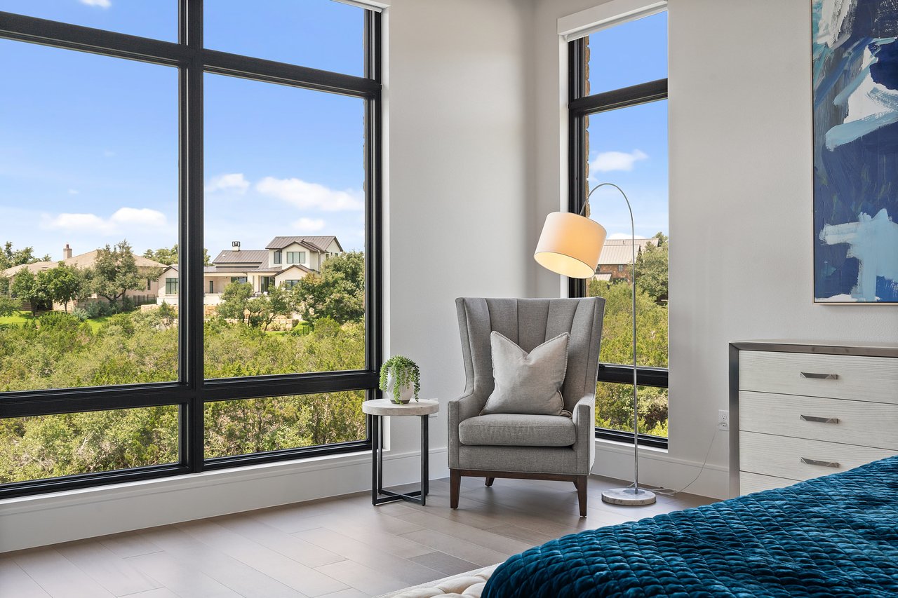 Retreat to the luxurious primary suite, where automatic shades, wood floors, and panoramic views create a serene atmosphere. The ensuite primary bath offers a spa-like experience with quartz countertops, dual sinks, a Victoria and Albert soaking tub, and a separate shower with multiple shower heads. The expansive walk-in closet with custom built-ins ensures ample storage space.